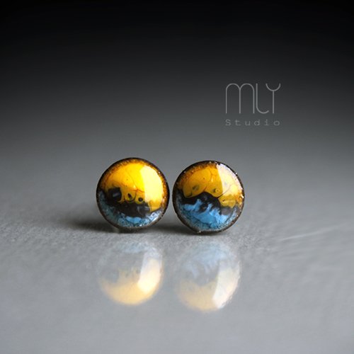 Okrągłe ceramiczne kolczyki w formie sztyftów, ręcznie wykonane z delikatnej gliny kamionkowej, jednostronnie szkliwione intensywnym żółtym i błękitnym szkliwem z efektem plamek, na antyalergicznych sztyftach w kolorze srebrnym. Średnica ok. 6mm.Polecam