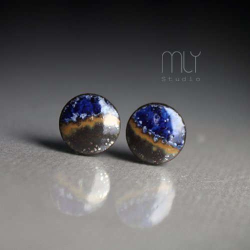 Okrągłe, lekko nieregularne ceramiczne kolczyki w formie sztyftów, ręcznie wykonane z delikatnej czekoladowobrązowej gliny kamionkowej, jednostronnie szkliwione mieszanką błekitno brązowych szkliw z efektem plamek i subtelnym połyskiem, na antyalergicznych sztyftach w kolorze srebrnym. Średnica ok. 9mm.Polecam