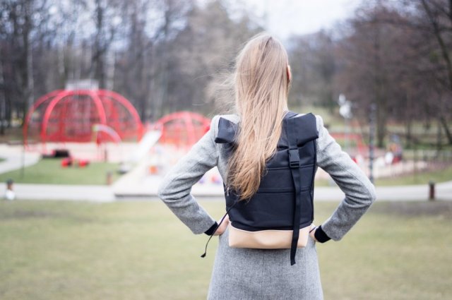 Plecak można nosić w różnych wysokościach, w zależności od zapięcia.