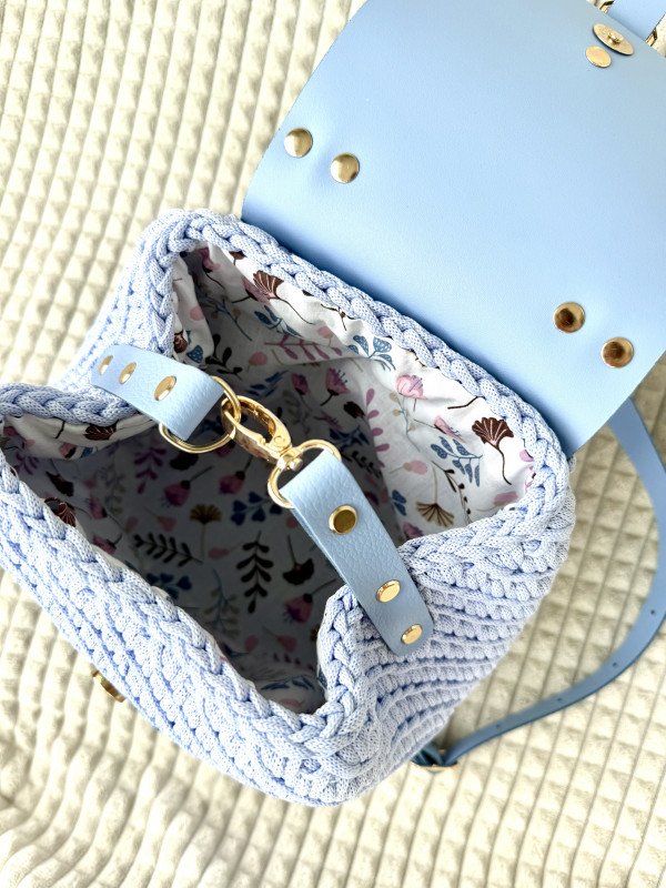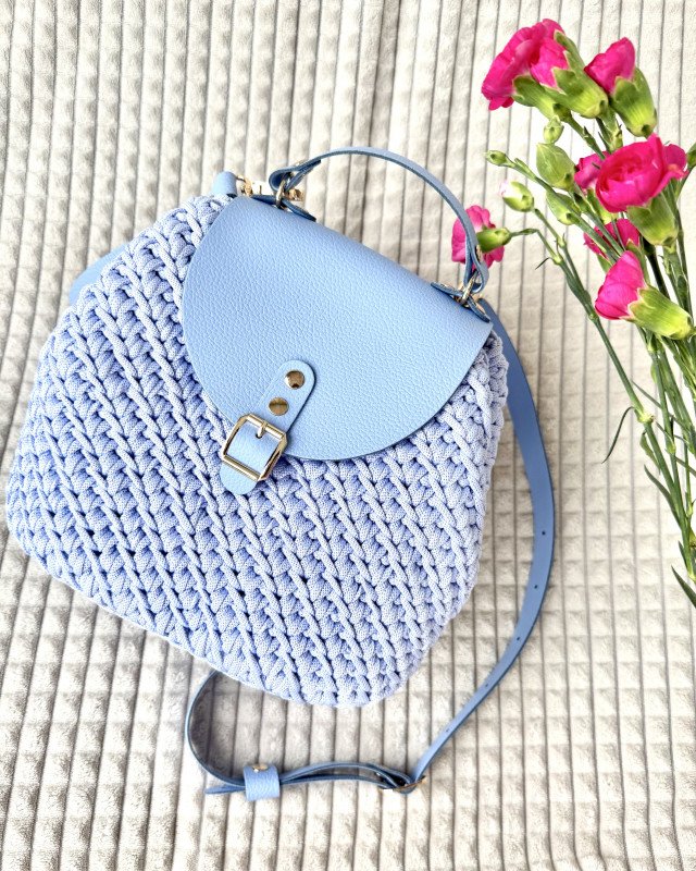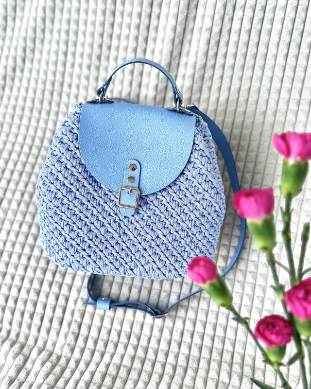 Plecak wykonany techniką szydełkową z wysokiej jakości sznurka i uzupełniony eleganckimi dodatkami ze skóry naturalnej: klapą, spodem i paskami. Posiada podszewkę.