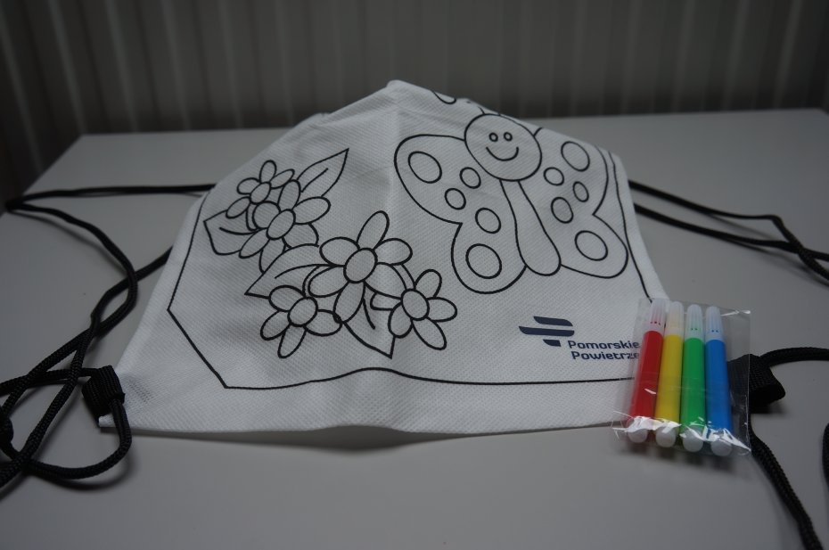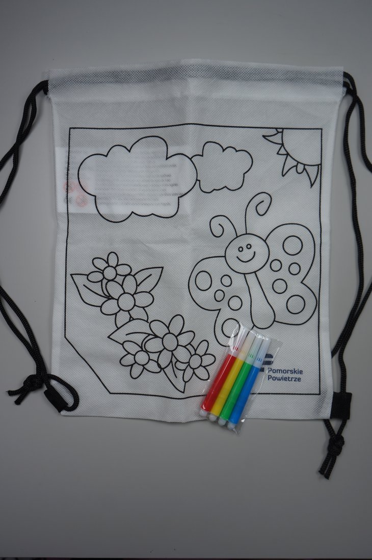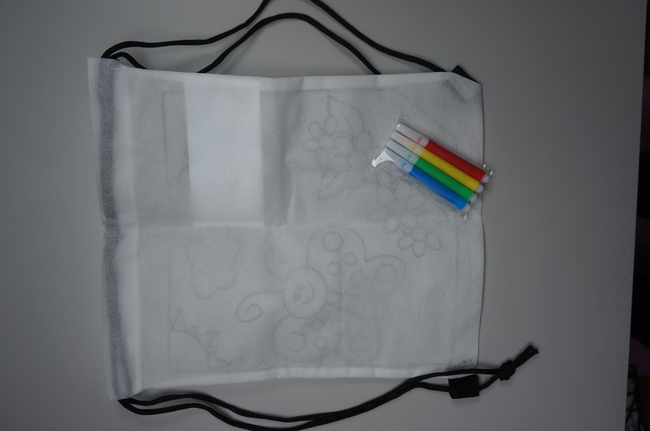 Biały worek - plecak ze sznurkami do przenoszenia. Ozdobiony nadrukowanym wzorem do kreatywnej zabawy, umożliwiający dzieciom pokolorowanie go według własnego uznania. Worek może służyć jako plecak na drobiazgi, worek na kapcie, czy też jako element dekoracyjny. Przeznaczony dla dzieci powyżej 3 roku życia. W zestawie 4 małe pisaki. Plecak nie można prać. Przedmiot nowy. Nieużywany. Stan bardzo dobry.