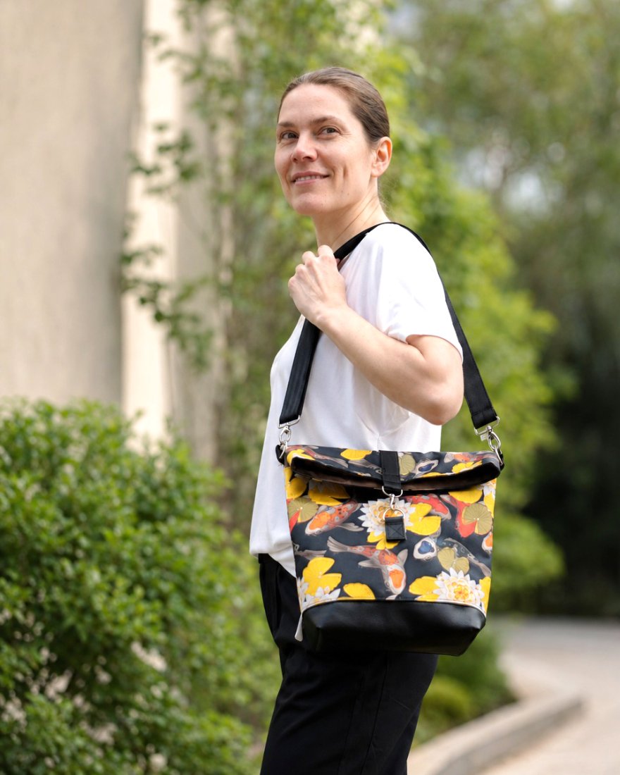 Praktyczna codzienna torebka-plecak, która może być noszona na trzy sposoby: jako torebka na ramię, torebka crossbody oraz plecak. Torebka jest wodoodporna, lekko usztywniana dzięki czemu trzyma kształt. Posiada dwa paski (w przypadku noszenia jako torba wystarczy jeden). Paski są wytrzymałe z grubej gładkiej taśmy z porządnymi karabińczykami. Torba zapinana na karabińczyk, nie wymaga rolowania, po prostu zawijamy lekko górną część.