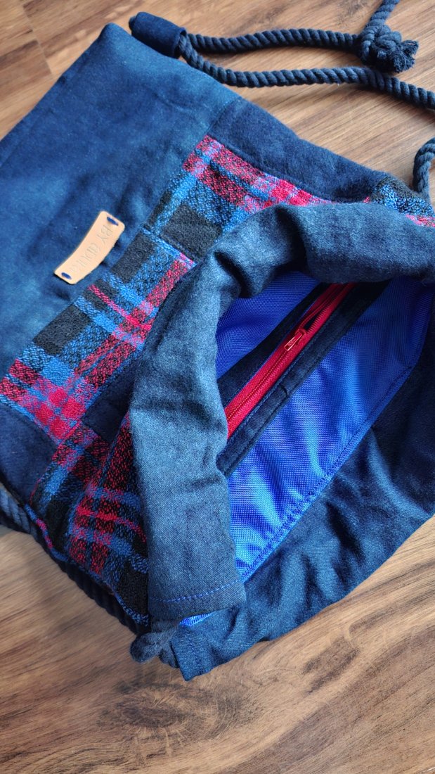 Ten worek to esencja recyklingu – stworzyłam go z materiałów z odzyskanego płaszcza. Połączenie głębokiego jeansu z fragmentami w klasyczną kratkę i pepitkę tworzy kompozycję, która pasuje zarówno do sportowej bluzy, jak i jesiennego trencza.