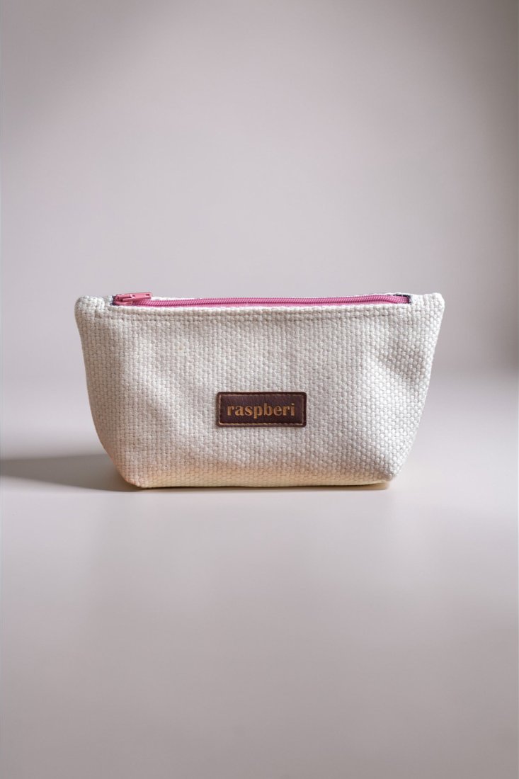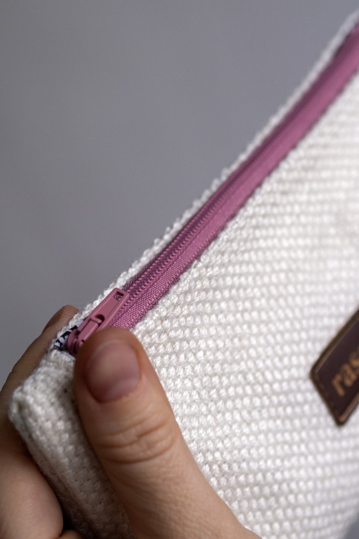 Średniej wielkości kosmetyczka wykonana z jasnej plecionki.