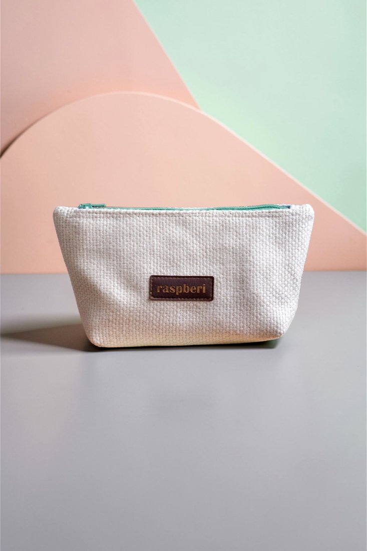 Średniej wielkości kosmetyczka wykonana z jasnej plecionki.