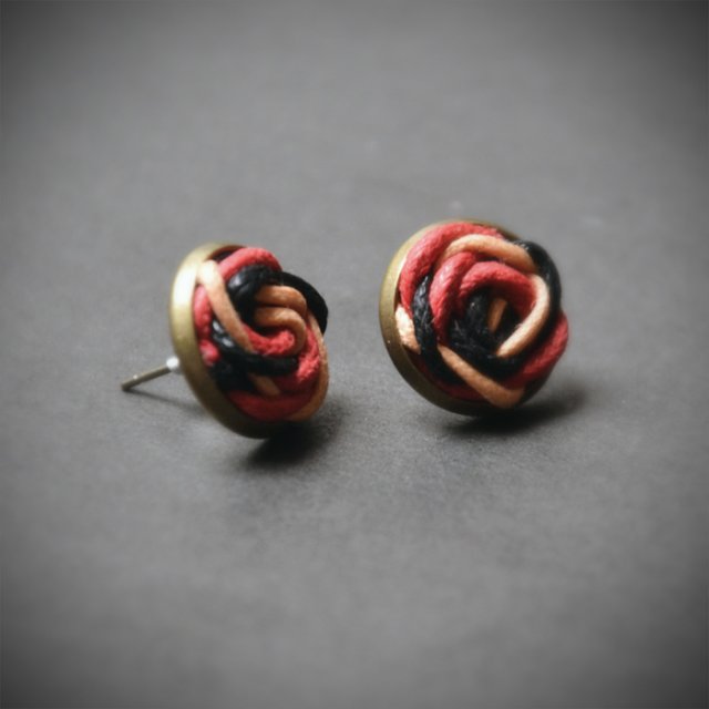 Delikatne sztyfty wykonane zostały z zaplecionych trzech kolorów sznureczka oraz metalowych elementów w kolorze antycznego brązu. Średnica ok 1,2 cm. Zapakowane w pięknym papierowym pudełeczku.