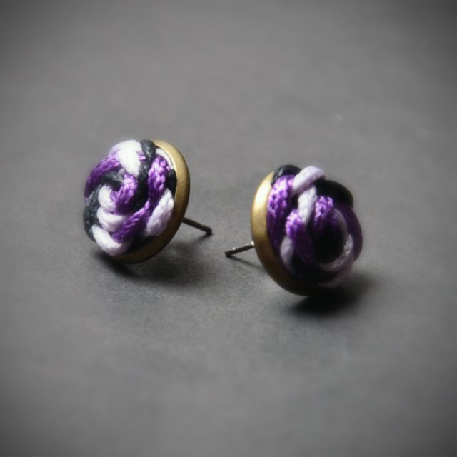Delikatne sztyfty wykonane zostały z zaplecionych trzech kolorów sznureczka oraz metalowych elementów w kolorze antycznego brązu. Średnica ok 1,2 cm. Zapakowane w pięknym papierowym pudełeczku.