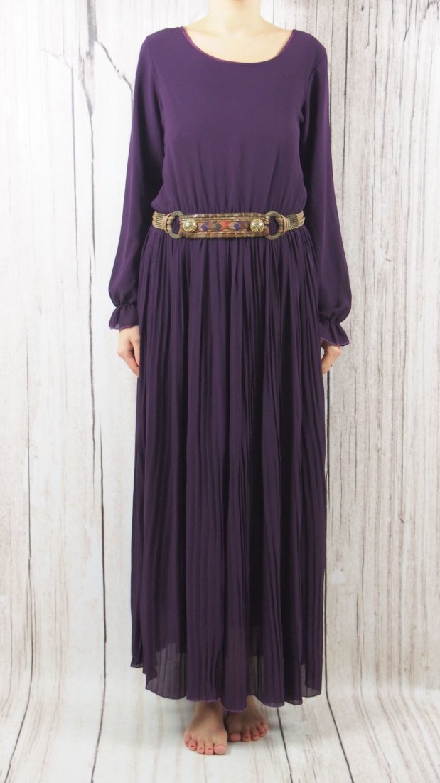 Sukienka plisowana w dolnej części. Pięknie się "leje". Na jesień idealnie w zestawieniu z wysokimi butami. Materiał, to moim zdaniem podszewka poliester, wierzch żorżeta. Pasek widoczny na zdjęciu gratis.