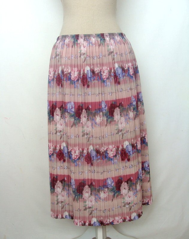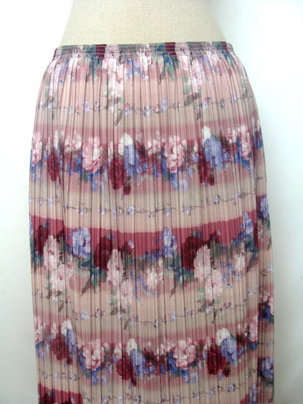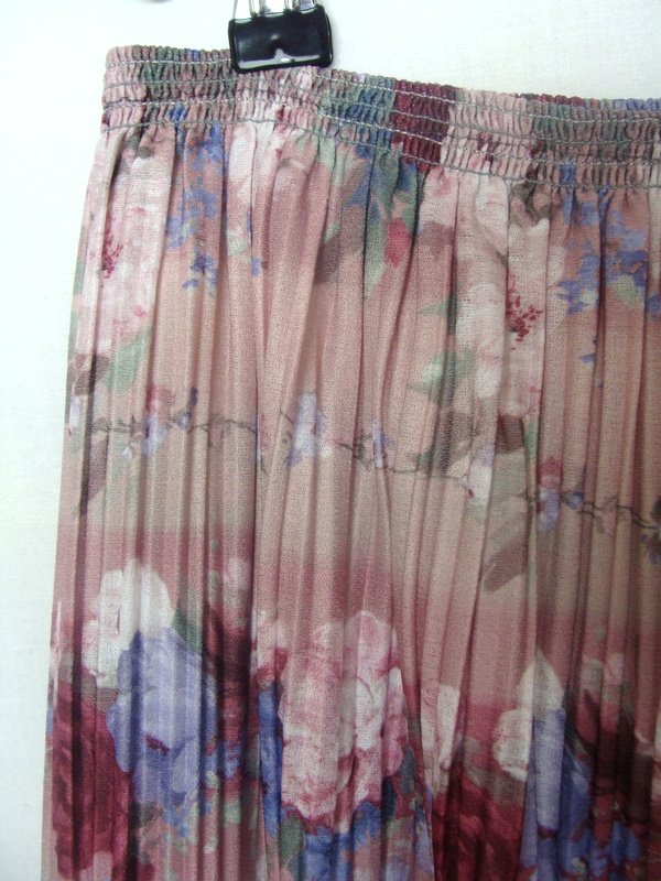 Midi spódnica drobno plisowana z wzorem kwiatowym w kolorystyce odcieni różu, beżu, borda i błękitu. Na gumie w pasie. Na rozciagliwej podszewce.
