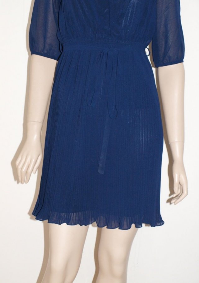 bardzo kobieca sukienka marki a wear. piękny granatowy kolor (ciemniejszy niż na zdjęciach). odcinana w pasie, przy dekolcie szeroki kołnierz, w pasie gumka, dół drobno plisowany. rękaw transparentny. pod spodem podszewka. wkładana bez zamka. Materiał 100% poliester. Stan bardzo dobry. Rozmiar z metki 38. na manekinie o rozmiarze 38. Podaję wymiary mierzone na płasko;