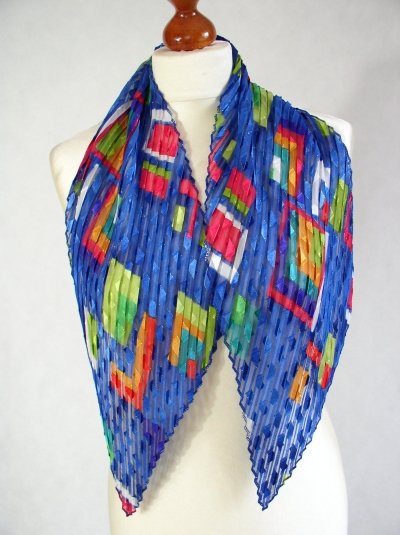 Mały szaliczek -plisowany.Żywe kolory.Brzeg obrzucony maszynowo.Stan bardzo dobry.Długość 122 cm.szerokość 23 cm.bez rozciągania.