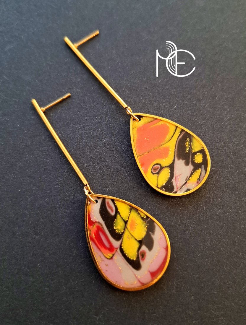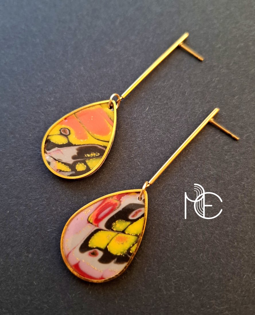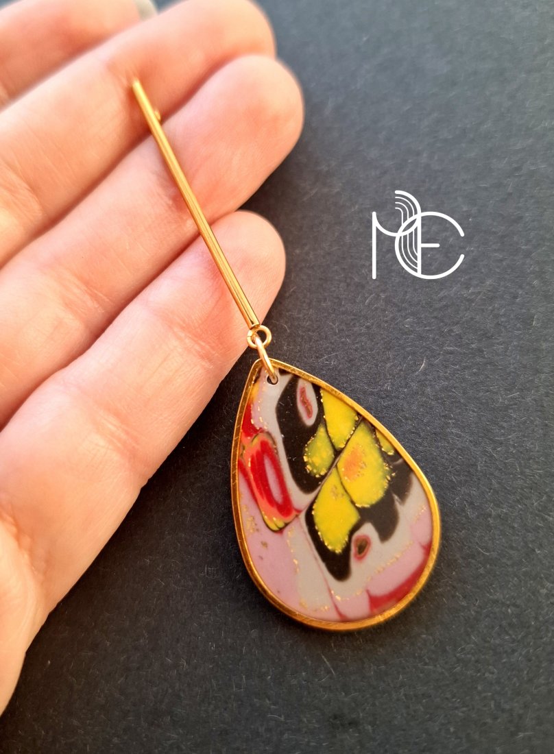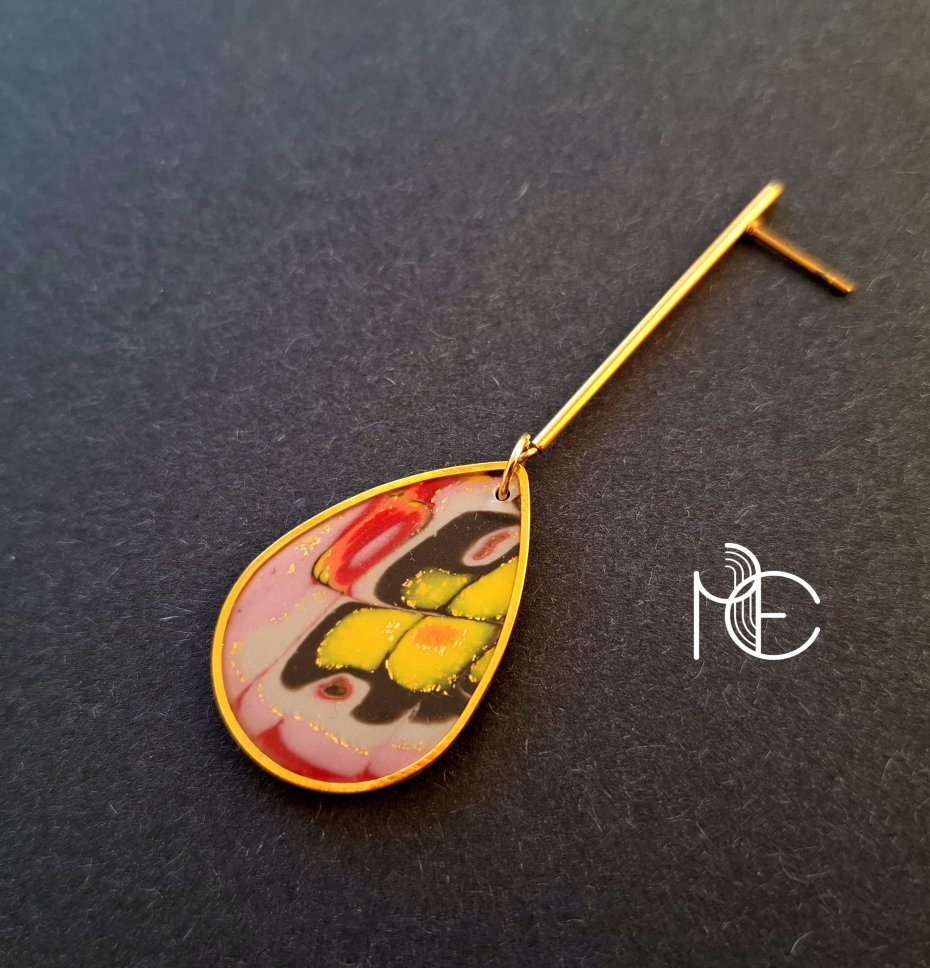 Kolczyki na sztyfty wykonane z wysokiej jakości glinki polimerowej i dodatkiem ozdobnych elementów metalowych. Sztyfty proste pozłacane i nieuczulające. Kolczyki jednostronne i lekkie. Wymiary: długość całkowita - 7,3 cm, szerokość 2,3 cm. Wykonane w jedynym egzemplarzu.