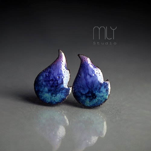 Oryginalne ceramiczne kolczyki w formie sztyftów, ręcznie wykonane z delikatnej kamionki, jednostronnie szkliwione fioletowo błękitnym szkliwem z efektem drobnych plamek, na antyalergicznych sztyftach w kolorze srebrnym. Długość ok 17mm. Polecam