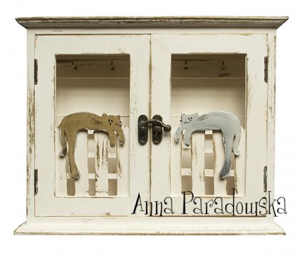 Drewniana szafka na klucze z dwoma kotami. Ręcznie pomalowana farbami akrylowymi, zabezpieczona lakierem półmatowym. Do powieszenia na ścianie. W środku 2 rzędy wieszaczków (2 x 5 haczyków).