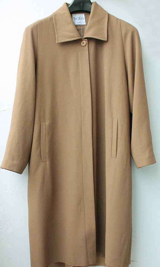Oryginalny płaszcz w niespotykanym kolorze tabaczkowym (ciemny beż z oliwkową nutą). Zapięcie na kryte guziki. Przy kołnierzyku i na mankietach ozdobne guziki. Idealna dla Pani o puszystych kształtach.Krój jest prosty, minimalnie rozszerzany ku dołowi. Idealny na wiosnę, lato i ciepłą jesień. Płaszcz jest dość cienki, ładnie się układa. Struktura tkaniny przypomina żorżetę. Płaszcz posiada podszewkę.
