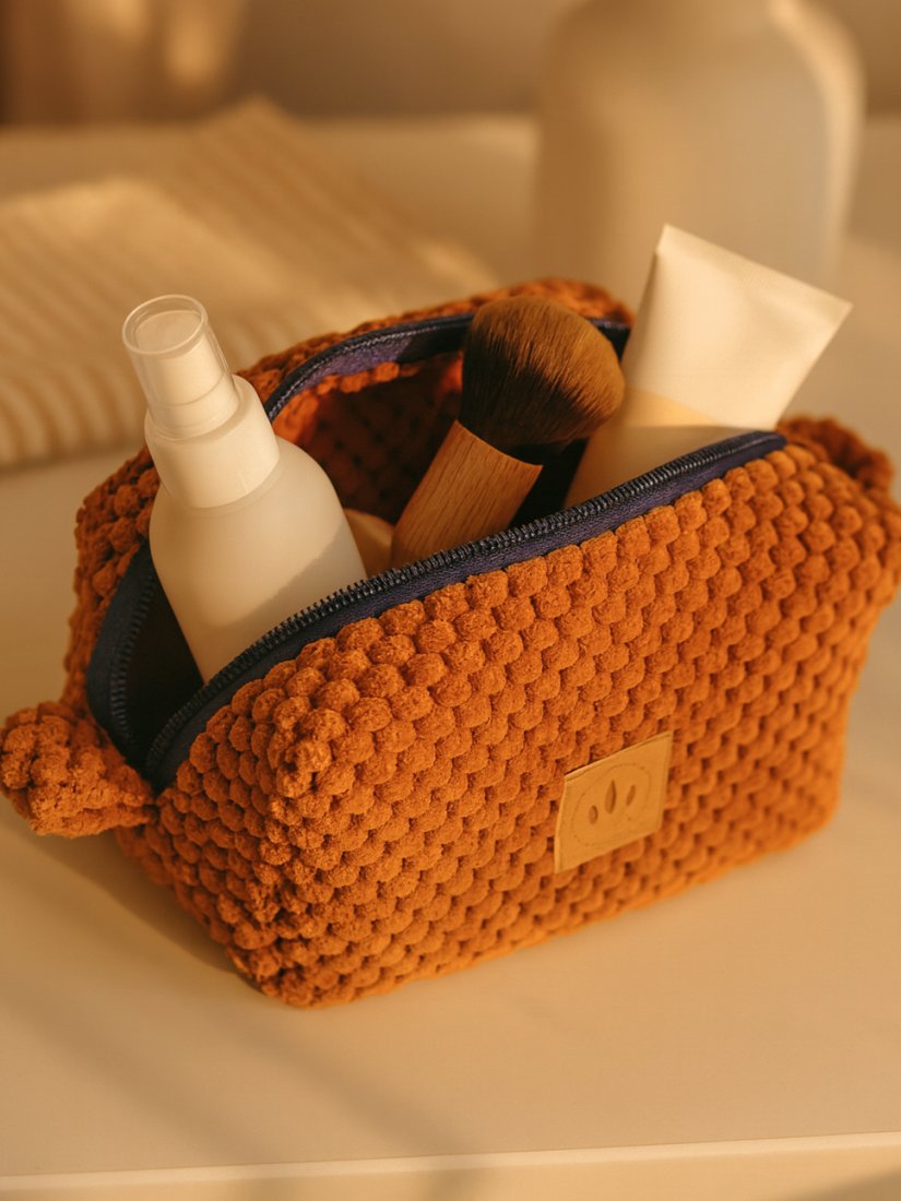 Średniej wielkości kosmetyczka z pluszowej, mięciutkiej tkaniny w kuleczki.
