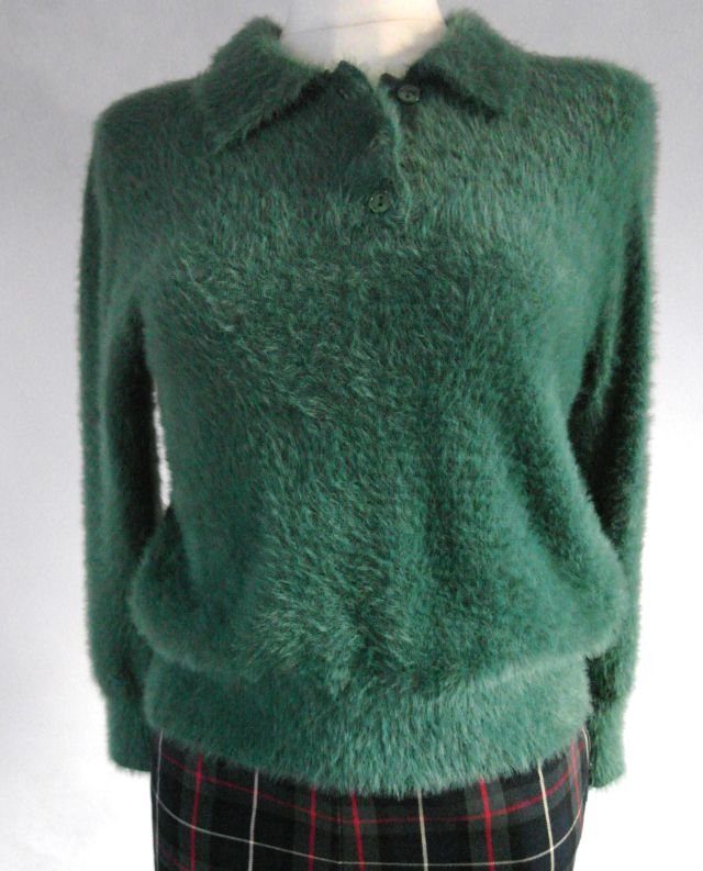 stonowana, chłodna zieleń.Pluszowa dzianina, milutka.Dosyć elastyczny.Fason krótki, styl na lata 70-te.Kobiecy.