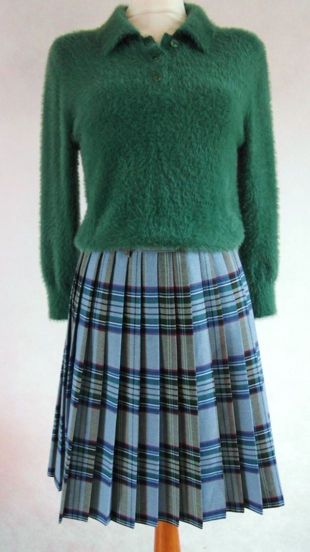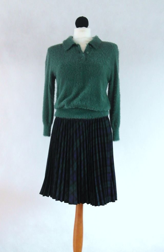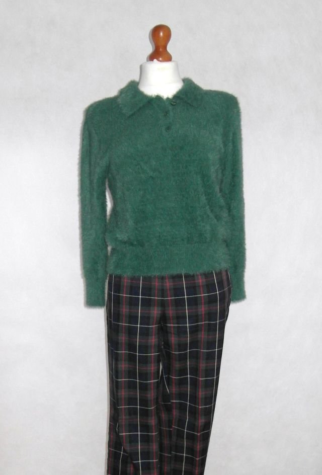 stonowana, chłodna zieleń.Pluszowa dzianina, milutka.Dosyć elastyczny.Fason krótki, styl na lata 70-te.Kobiecy.