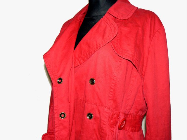 Piękny czerwony trencz od Vero Moda. Uszyty z grubszej mięsistej bawełny, na poliestrowej podszewce. Zapinany na duże metalowe zatrzaski, przewiązywany paskiem. Z tyłu od pasa w dół ozdobne zakładki.