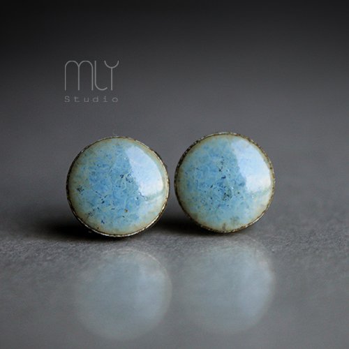 Ceramiczne kolczyki w formie sztyftów, ręcznie wykonane z delikatnej gliny kamionkowej, jednostronnie szkliwione zielonkawo błękitnym szkliwem z efektem plamek, na antyalergicznych sztyftach w kolorze srebrnym.Średnica ok. 11mm.Polecam