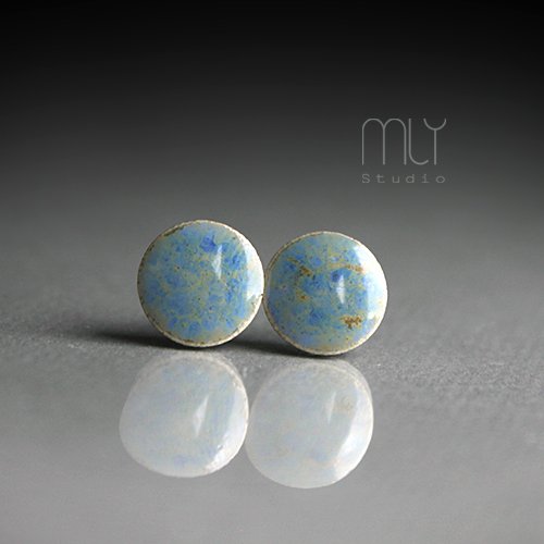 Ceramiczne kolczyki w formie sztyftów, ręcznie wykonane z delikatnej gliny kamionkowej, jednostronnie szkliwione zielonkawo błękitnym szkliwem z efektem plamek, na antyalergicznych sztyftach w kolorze srebrnym.Średnica ok. 9mm.Polecam