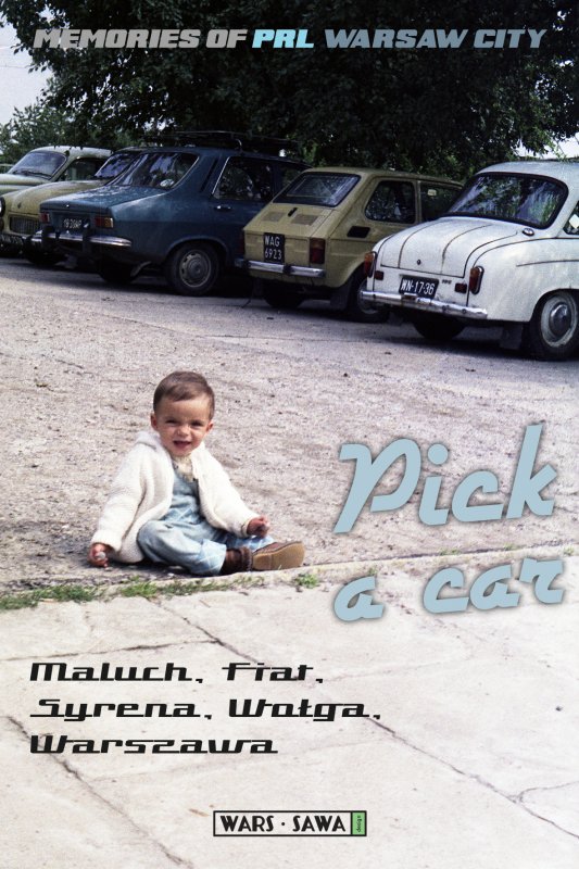 Pocztówka z serii Memories of PRL, Pick a car, na bazie autorskiego zdjęcia wykonanego w latach 80-tych, w roli głównej dziecko i auta: Warszawa, Maluch, Fiat, Syrena, Wołga. Rozmiar 10x15 cm, rewers anglojęzyczny.