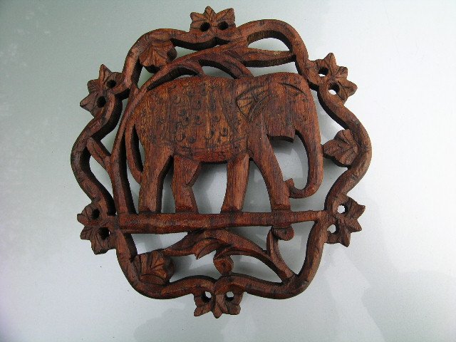 Ciekawa Podstawka pod Garnki...Z drewna Egzotycznego,nie wiem jakiego. Indyjska. Ręcznie wykonana,olejowana - w wyrazie matowa. Od dołu dystansujące nóżki. Można ją też powiesic jako oryginalną ozdobę :) No i słoń ma jednak w górę trąbę :)