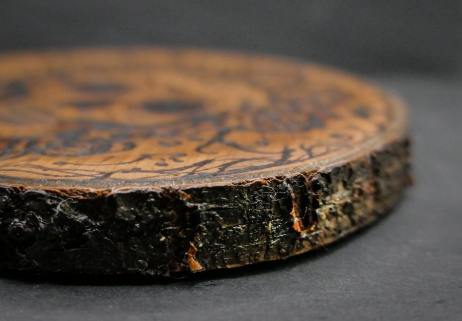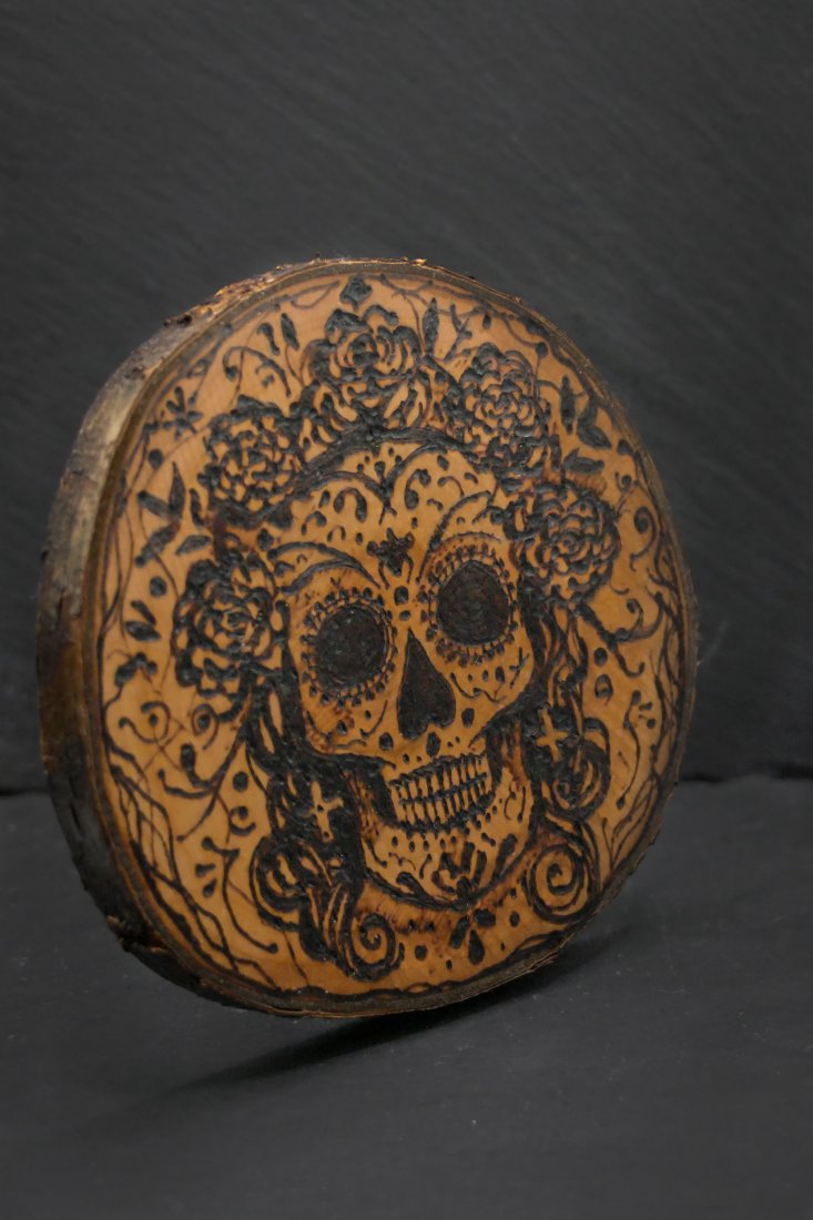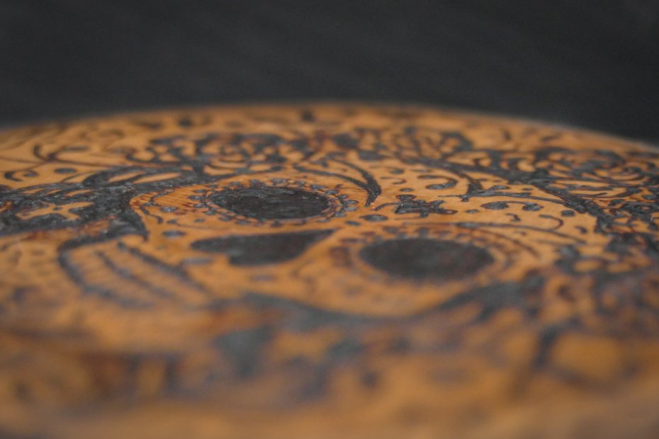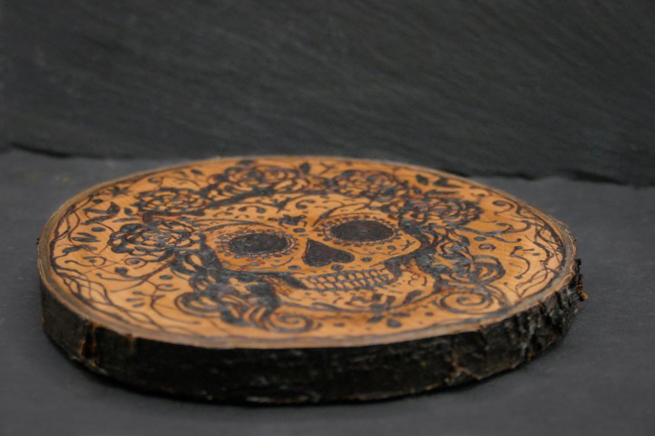 Artystyczna podkładka z naturalnego drewna gruszy, zdobiona w technice pirografii. Ręcznie wypalony motyw czaszki z kwiatami nawiązuje do meksykańskiego Dnia Zmarłych – symbolu radości życia i pamięci.