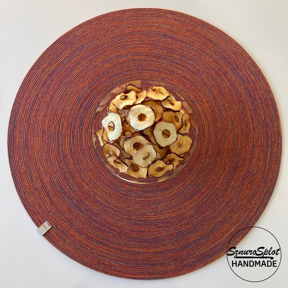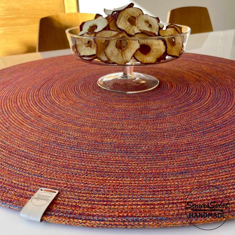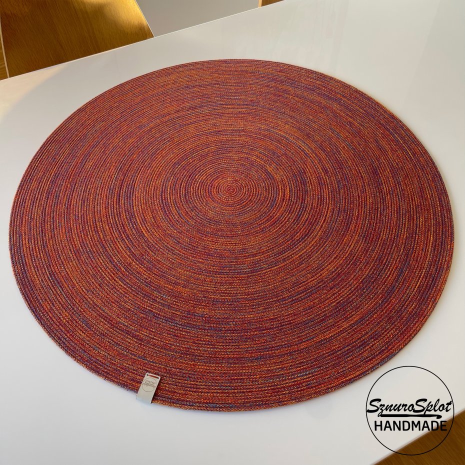 Podkładka ze sznurka uszyta w przykładowej kolorystyce ciepłego melanżu (nie zamieszczony we wzorniku, ale dostępny) Proszę dokonać wyboru kolorystyki zamawianego projektu i napisać w uwagach. Jeśli potrzebny jest kolor nie zamieszczony we wzorniku proszę pytać.