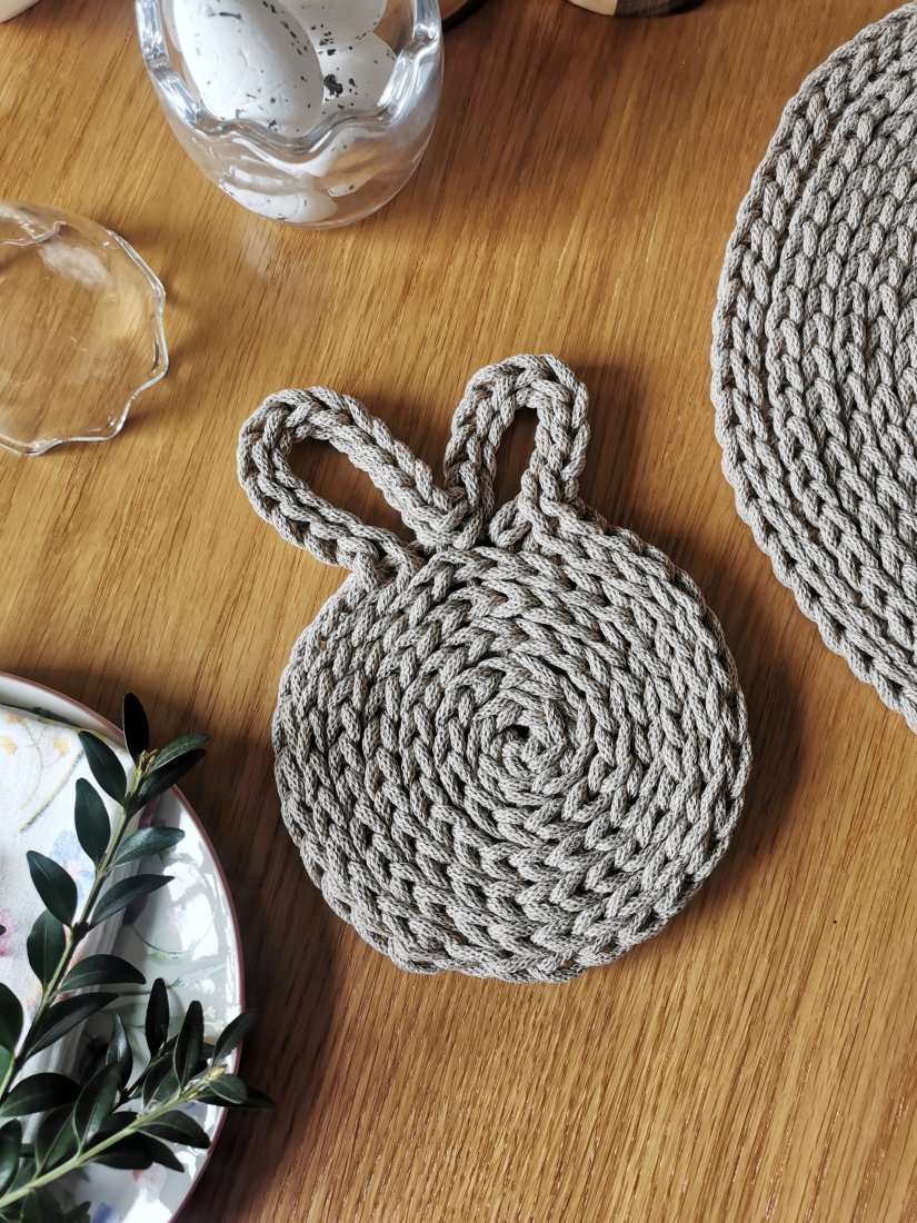 Ta bawełniana podkładka pod kubek lub szklankę z uroczymi uszami królika to drobny detal, który wprowadza do wnętrza radosny, wiosenny klimat. Wykonana ze sznurka bawełnianego i zapleciona gęstym wzorem, nie tylko pięknie wygląda, ale także chroni blat stołu przed ciepłem kubków i szklanek.