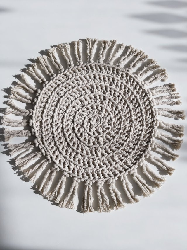 Dekoracyjna podkładka średnicy 30cm plus frędzle (razem 44cm) spleciona z cerrtyfikowanego 100% sznurka bawełnianego grubości 5mm w kolorze beżowym (nr-3 wzornik kolorów).