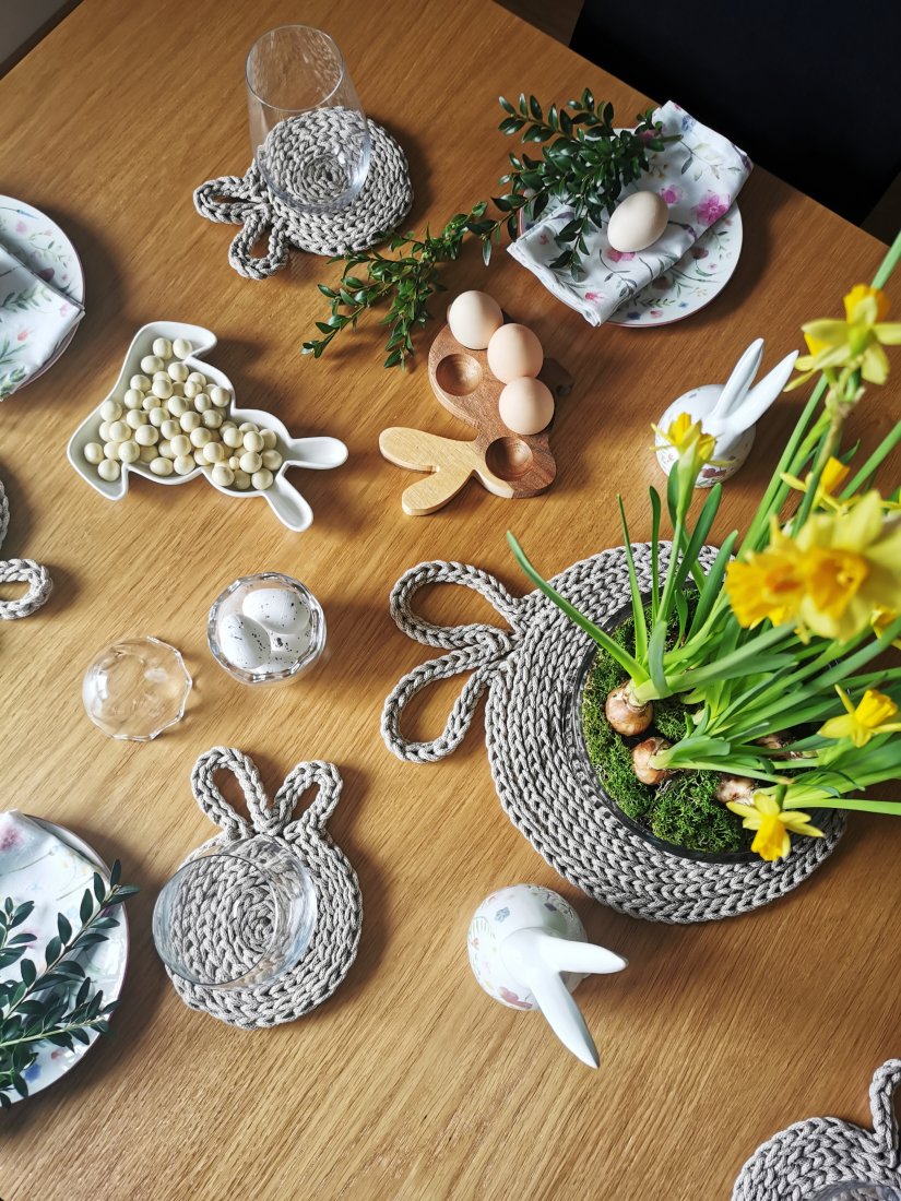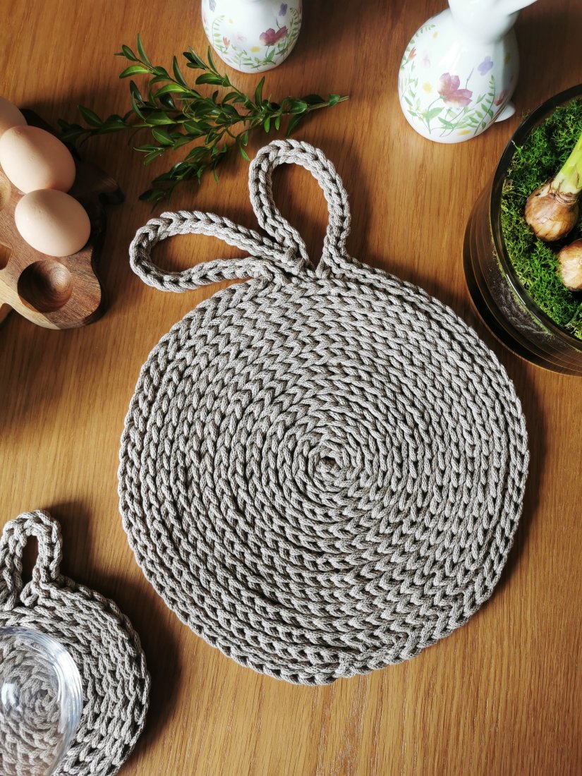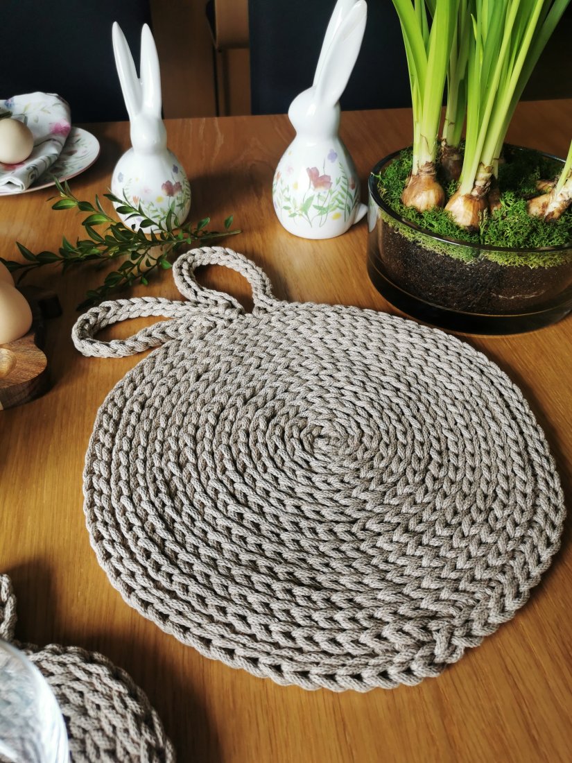 Podkładka na stół z uszami królika wykonana ze sznurka bawełnianego.