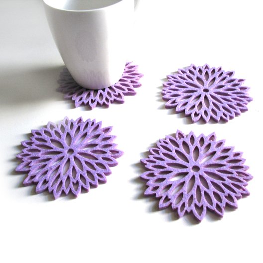 Zestaw czterech ślicznych podkładek pod kubki, wycięte laserowo z filcu 4mm w kolorze liliowym. Urocze, frywolne, lekkie. Pięknie wyglądają na stole, mogą stanowić zestaw z dostępnymi w sklepie produktami z tej samej kolekcji. Idealnie nadają się na prezent. polecam średnica podkładki ok 11cm,