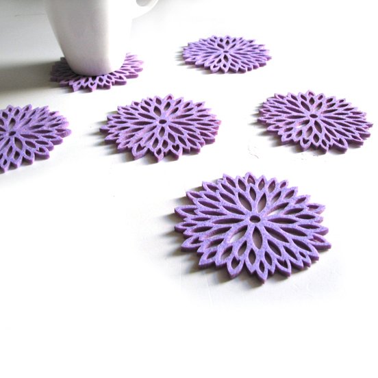 Zestaw sześciu ślicznych podkładek pod kubki, wycięte laserowo z filcu 4mm w kolorze liliowym. Urocze, frywolne, lekkie. Pięknie wyglądają na stole, mogą stanowić zestaw z dostępnymi w sklepie produktami z tej samej kolekcji. Idealnie nadają się na prezent. polecam średnica podkładki ok 11cm,