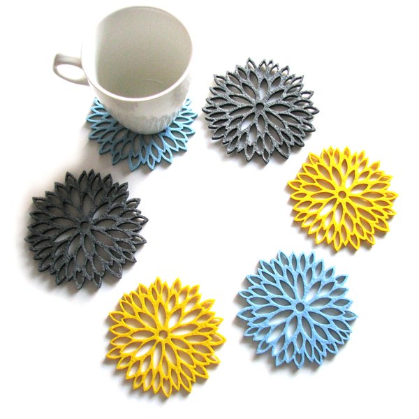 Zestaw sześciu ażurowych podkładek pod kubki, wyciętych laserowo w filcu 4mm, w kolorze szarym, błękitnym i żółtym. Urocze, frywolne, lekkie. Pięknie wyglądają na stole, mogą stanowić zestaw z dostępnymi w sklepie produktami z tej samej kolekcji. Idealnie nadają się na prezent. polecam! średnica podkładki ok 10,5 cm