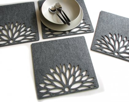 Zestaw czterech podkładek pod talerze, wyciętych laserowo w szarym filcu 4mm, podkładki w kwadracie, długość boku 30cm. Pięknie prezentują się na stole, mogą być skompletowane z innymi produktami w kształcie astrów, dostępnymi w mojej galerii. Polecam!