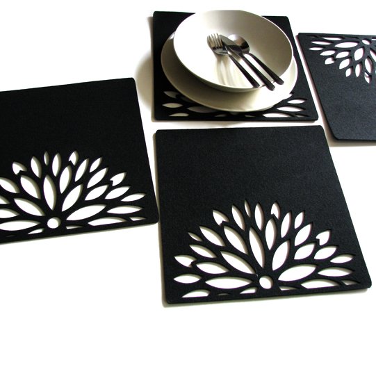 Zestaw sześciu podkładek pod talerze, wyciętych laserowo w czarnym filcu 4mm, podkładki w kwadracie, długość boku 30cm. Pięknie prezentują się na stole, mogą być skompletowane z innymi produktami w kształcie astrów, dostępnymi w mojej galerii. Polecam!