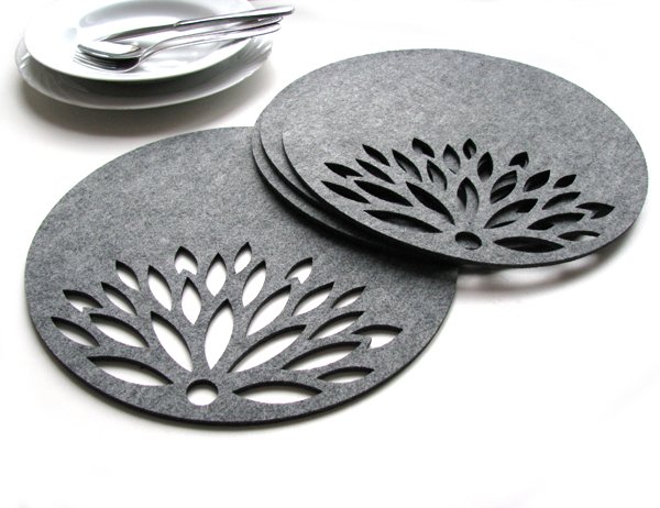 Zestaw czterech podkładek pod talerz wyciętych laserowo w szarym filcu. Okrągłe, na połówce wycięty ażurowy aster. Oryginalne, stanowią uroczy dodatek dla wnętrza. Grubość filcu 4mm, więc podkładki idealnie nadają się również jako podkładki pod duże naczynia, chroniące stół przed zniszczeniem. Idealne również na prezent. polecam podkładka okrągła o średnicy 30cm