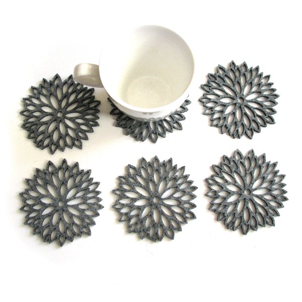 Zestaw sześciu ślicznych podkładek pod kubki, wycięte laserowo z szarego filcu 4mm. Urocze, frywolne, lekkie. Pięknie wyglądają na stole, mogą stanowić zestaw z dostępnymi w sklepie produktami z tej samej kolekcji. Idealnie nadają się na prezent. polecam średnica podkładki ok 11cm,