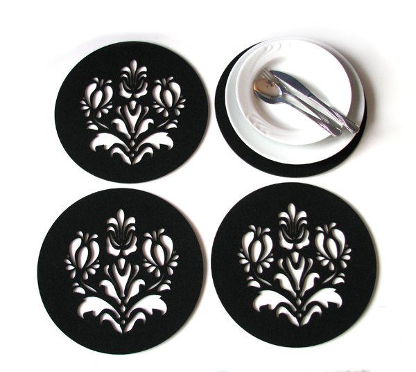 Zestaw czterech okrągłych podkładek, wyciętych laserowo w czarnym filcu o grubości 4mm. Piękne, ażurowe, stanowią wyrazisty dodatek we wnętrzu. Zainspirowane sztuką ludową, we współczesnym wykonaniu. Średnica podkładki: 30cm.