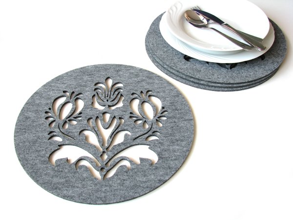 Zestaw czterech okrągłych podkładek, wyciętych laserowo w szarym filcu o grubości 4mm. Piękne, ażurowe, stanowią wyrazisty dodatek we wnętrzu. Zainspirowane sztuką ludową, we współczesnym wykonaniu. Istnieje możliwość zmiany kolorów koralików, średnica podkładki: 30cm.
