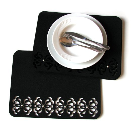 Zestaw sześciu podkładek, wyciętych laserowo w czarnym filcu o grubości 4mm. Piękne, ażurowe, stanowią wyrazisty dodatek we wnętrzu. Zainspirowane sztuką ludową, we współczesnym wykonaniu. Złożone razem tworzą piękny bieżnik, z długim i wyrazistym, kwiatowym szlakiem. wielkość podkładki: 30cm x 40cm.