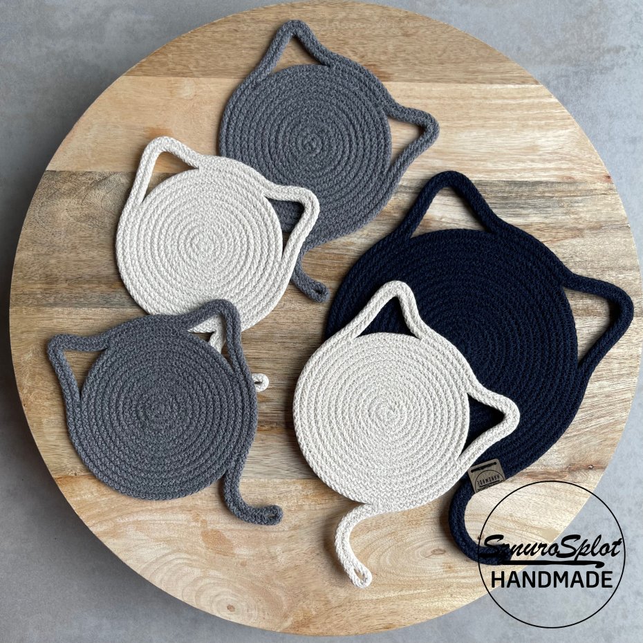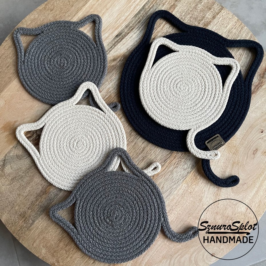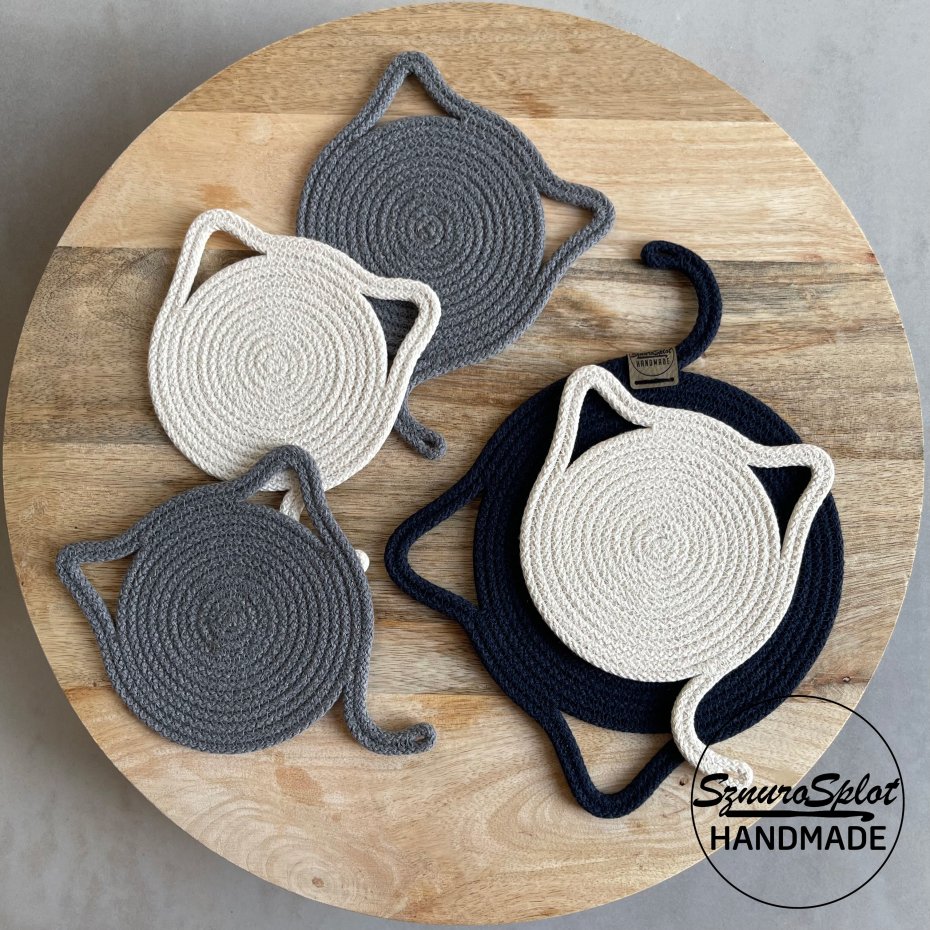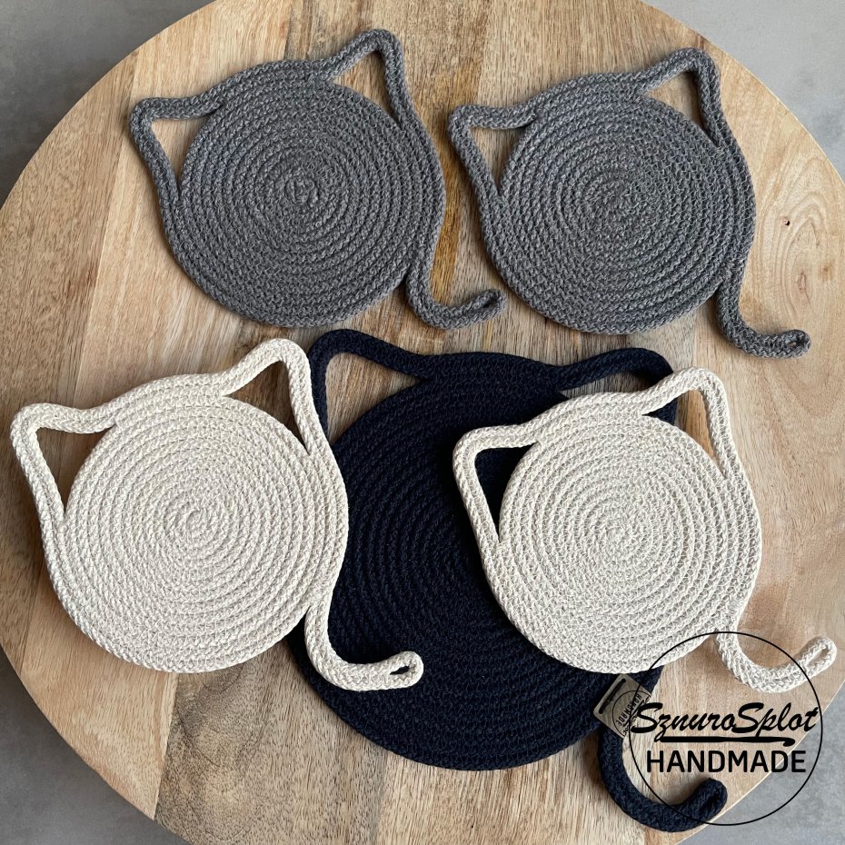 Zestaw pięciu podkładek pod kubki z bawełnianego sznurka.