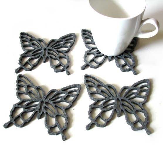 Zestaw czterech podkładek wyciętych laserowo w szarym filcu. Urocze, frywolne motyle to piękny i wyrazisty dodatek do wnętrza. Idealne pod kubki, szklanki, filiżanki, a zestawione razem pod misę, czy inne większe naczynie. Polecam. Filc syntetyczny o grubości 4mm. Wielkość podkładki ok. 11cm x 9,8cm;