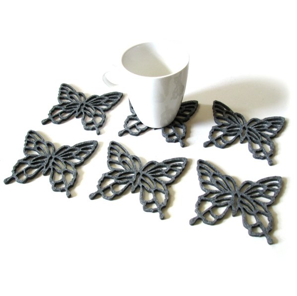Zestaw sześciu podkładek wyciętych laserowo w szarym filcu. Idealne Urocze, frywolne motyle to piękny i wyrazisty dodatek dla nowoczesnego wnętrza. Idealne pod kubki, szklanki, filiżanki, a zestawione razem pod misę, czy inne większe naczynie.