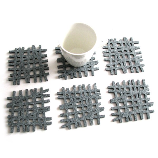 Zestaw sześciu podkładek wyciętych laserowo w szarym filcu 4mm. Proste i oryginalne, stanowią ciekawy, modny i praktyczny dodatek na stół. Podkładka kwadratowa, długość boku ok.11cm. Inne kolory, wielkości lub większe ilości dostępne na zamówienie, proszę o kontakt!