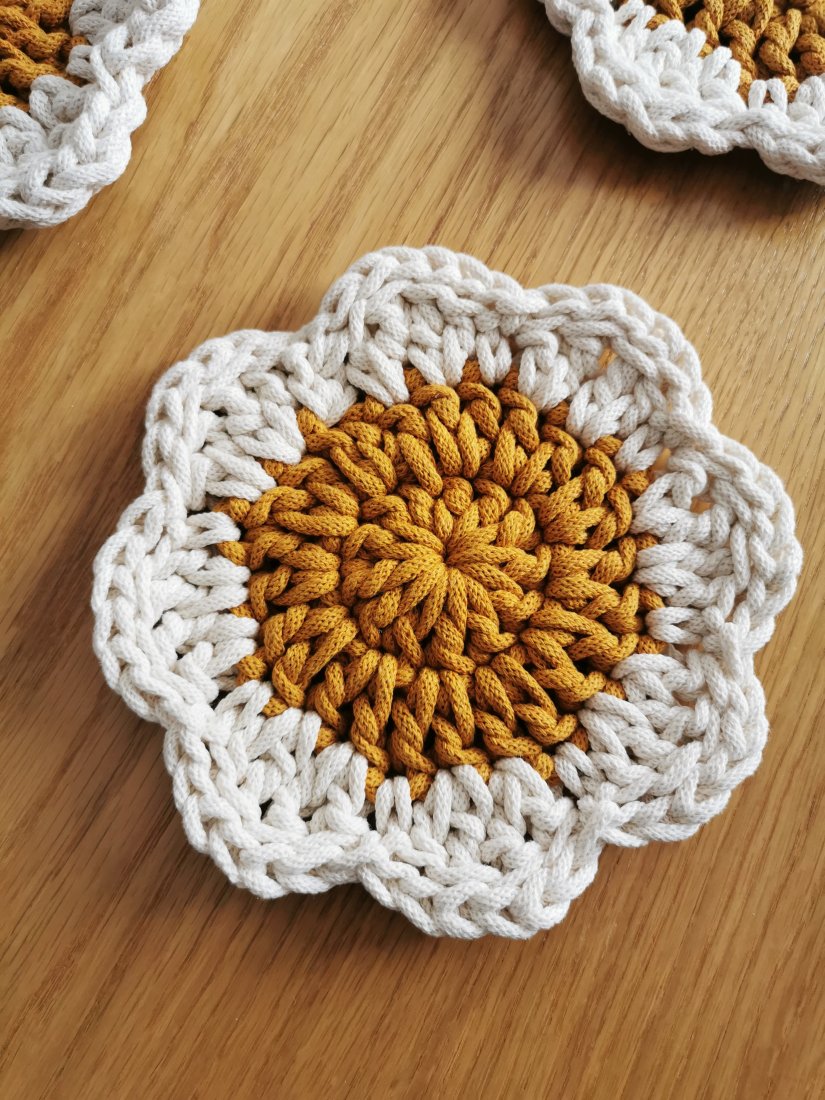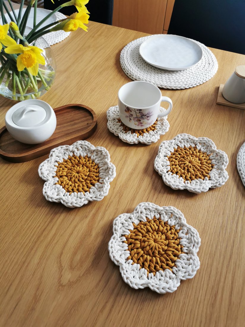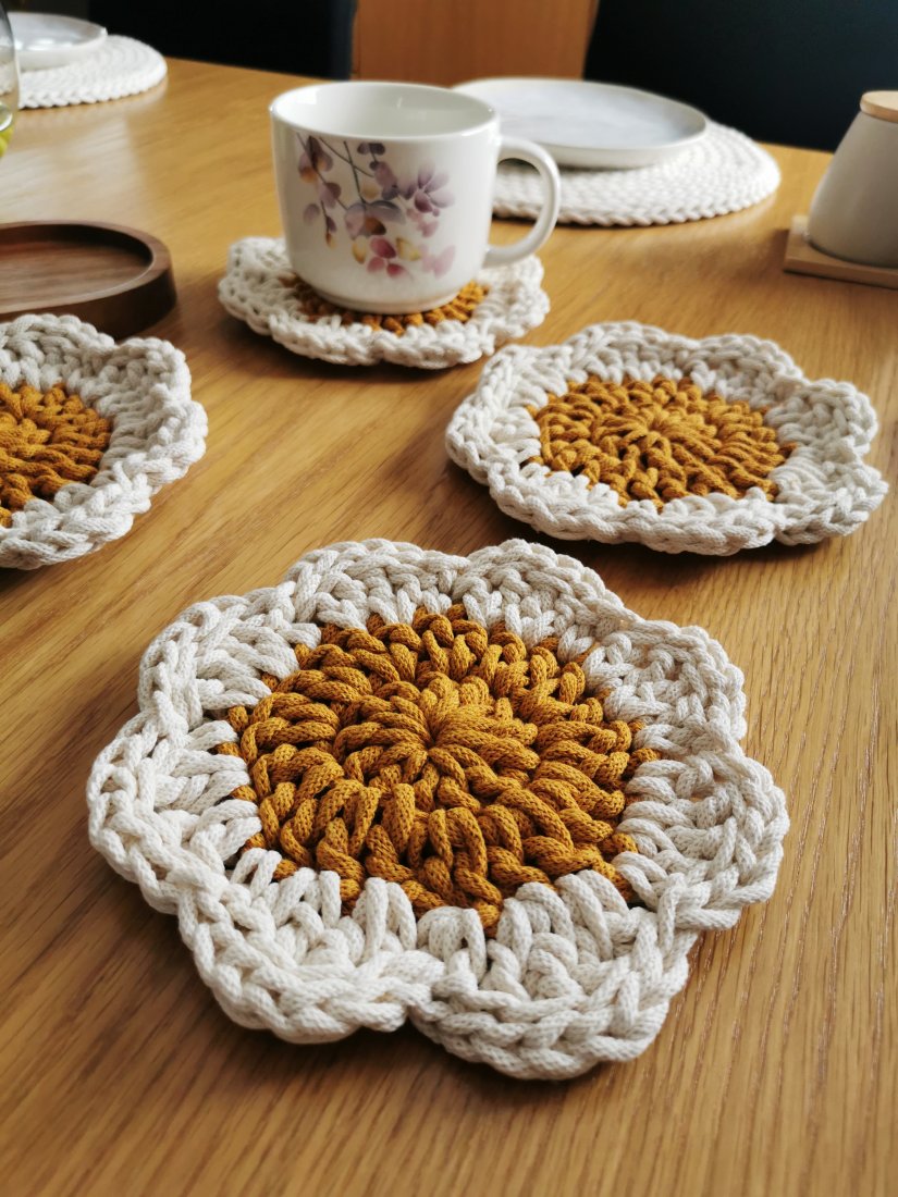 Wykonane w 100% z naturalnej bawełny, łączą w sobie funkcjonalność i estetykę. Delikatny, kwiatowy kształt sprawia, że każdy stół nabiera przytulnego, stylowego charakteru — niezależnie od tego, czy pijesz poranną kawę, jesz śniadanie z bliskimi czy organizujesz spotkanie przy stole.