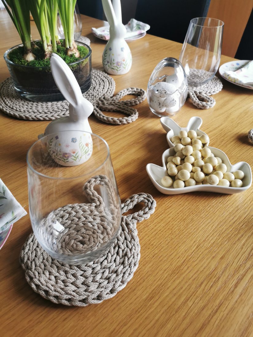 Okrągła część podkładek ma średnicę ok. 14 cm, a dekoracyjne uszy o długości ok. 5 cm nadają im lekki, świąteczny charakter. Idealnie sprawdzą się na wielkanocnym stole, podczas rodzinnego śniadania, wiosennej kawy lub herbaty z bliskimi.