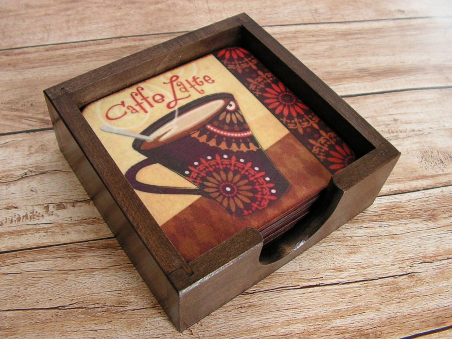 Elegancki komplet aż 8 drewnianych podkładek pod kubki, szklanki lub filiżanki, umieszczony w otwartym drewnianym pudełku.