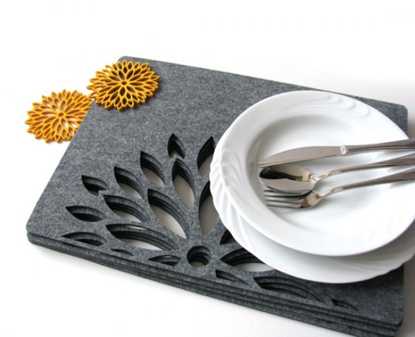 Zestaw ośmiu podkładek pod talerz wyciętych laserowo w szarym filcu. Prostokątne, na środku wycięty eliptyczny aster. Oryginalne, stanowią uroczy dodatek dla wnętrza.